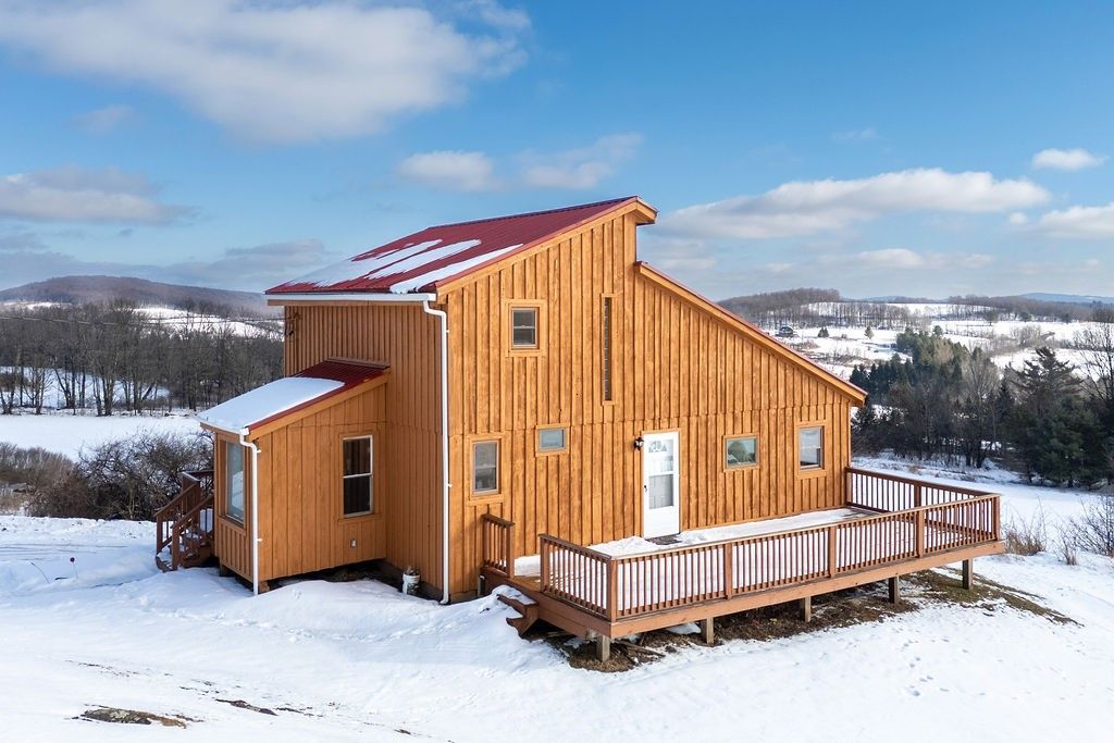 Set against a breathtaking Catskills backdrop, this 18+ acre retreat offers a beautifully renovated contemporary home plus expansive land with soul-stirring views in every direction. The home is perfectly positioned to overlook sweeping meadows and dramatic mountain ridgelines, all set along a quiet, town-maintained road. Inside, the residence has been thoughtfully updated to feel warm, inviting, & effortlessly livable. A practical mudroom entry leads into a stunning open great room with soaring ceilings & wood floors around a cozy woodstove. Electric heat zones allow for flexible, efficient comfort throughout the seasons. A three-season room draws the outdoors in, offering endless opportunities to take in the views. Step outside onto the expansive deck, and you'll understand why this setting is so special-sunrises over the mountains, golden afternoon light across the fields, and sunsets that feel almost unreal. The main level features a serene primary bedroom and a beautifully finished full bath with tiled tub/shower. Upstairs, 2 additional bedrooms & half bath provide space for guests, family, or creative pursuits. One bedroom includes a whimsical crow's nest loft-an inspired hideaway for reading, dreaming, or admiring the views. A full basement offers excellent potential for future living space. Beyond the home, the land is extraordinary. The 8 acres roll out in gently sloping fields, woods, & open skies-ideal for those seeking privacy, room to roam, or the opportunity to expand. Whether you envision gardens, trails, additional structures, or simply uninterrupted space to enjoy nature, the land elevates this property into something truly special. Located in the heart of Hamden, you're surrounded by the charm that makes the western Catskills so beloved: hiking, Delaware River, historic covered bridge, vintage baseball team, and the welcoming Hamden Inn, a favorite gathering spot for locals and visitors alike. This is more than a home-it's an 18-acre Catskills lifestyle, where views, land, and thoughtful design come together in perfect harmony. A place to unplug, to gather, and to experience the quiet magic of upstate New York.